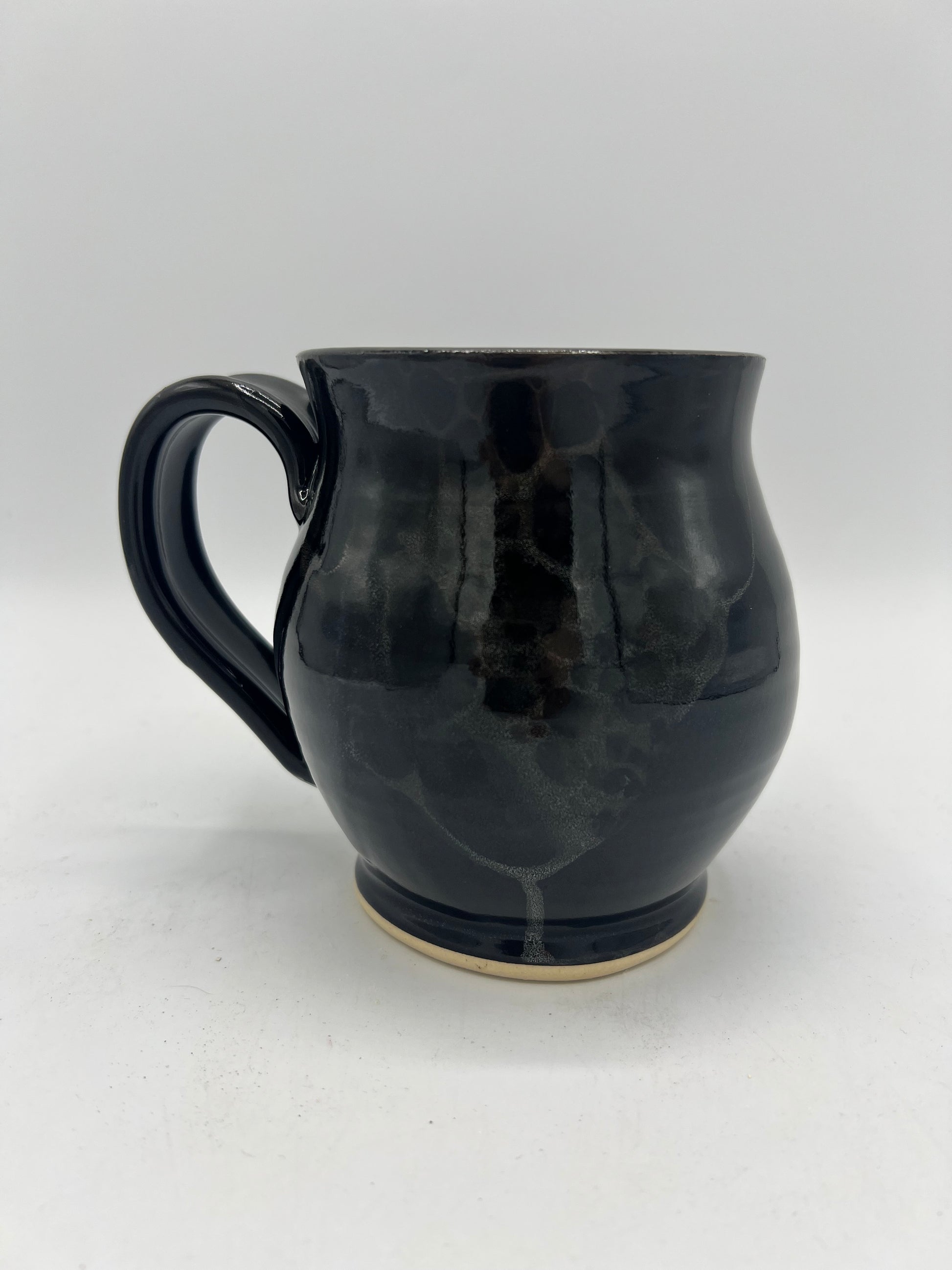 This fun spooky season mug as a shiny black glaze that is as dark as midnight. For a witchy flare, I blew some white bubble onto the outside of the cauldron to look like a witches brew. Subtle but effective. Happy Halloween!